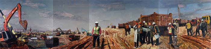 《晨曦——引江济淮工地掠影》作者:杨国新、项春生、赵振华、李峰 油画 2018年